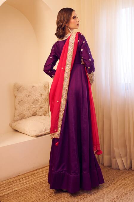 Purple Anarkali featuring full sleeves, boat neckline, and intricate embroidery with cutdana and sequins. Paired with a hot pink floral buti embroidered dupatta.