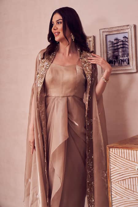 Gold Organza Crystals, Cut Bloom Embroidered Cape With Waterfall Drape Gown