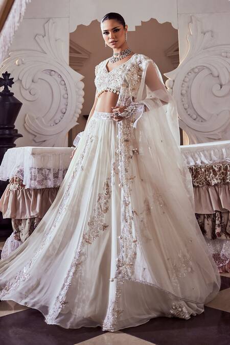 Ivory lehenga featuring all over bloom vine embroidery with sequin, cutdana & pearl highlights. Paired with a padded blouse adorned with sequin blossom embroidery and a dupatta with embroidered borders.
