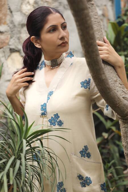 Ivory kurta featuring blue floral block prints, V neckline, and three-quarter sleeves. Paired with matching pants and includes pockets for added convenience.