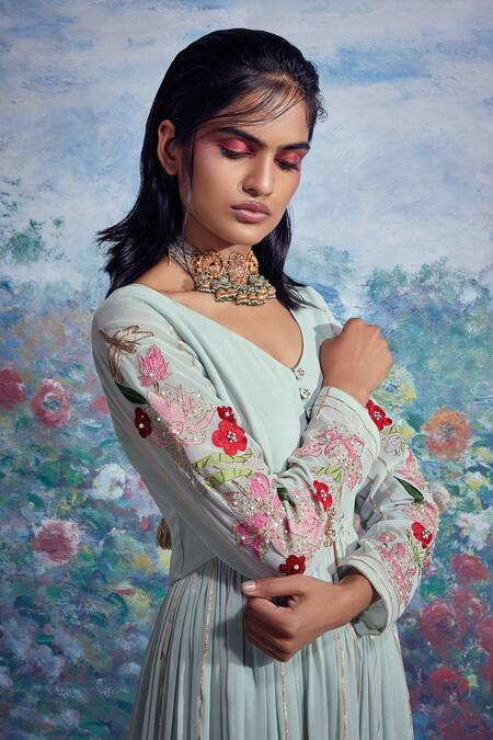 Ice blue anarkali with embroidered floral motifs on sleeves. Comes with flared pant.