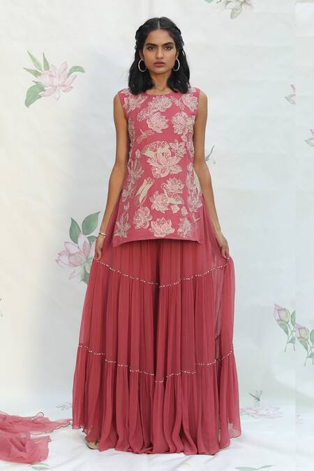 Pink Tulle, Chiffon, Georgette Round Embroidered Kurta And Palazzo Set
