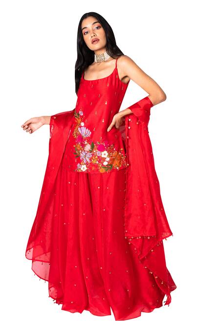 Red short kurta with floral embroidered motifs & sequin work. Paired with embroidered sharara & embroidered organza dupatta.