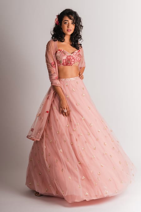 Pink lehenga with sequin and bead embroidered floral motifs. Comes with crop top and dupatta.