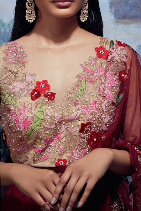 Maroon Organza, Tulle Round Embroidered Bridal Lehenga Set