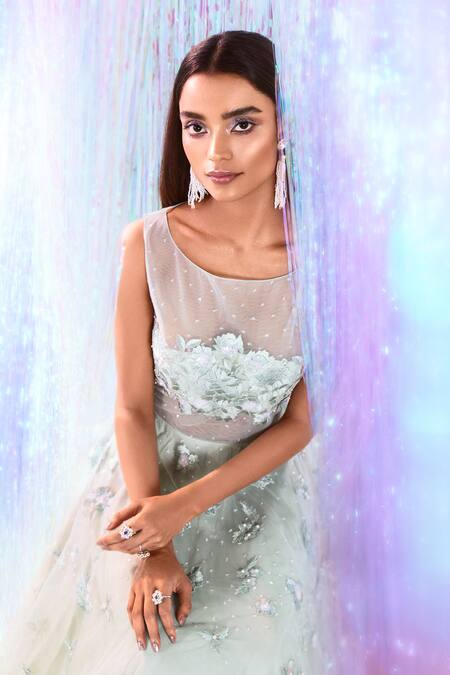 Mint green tulle flared gown with sheer panel & all-over floral motif thread, bead work.