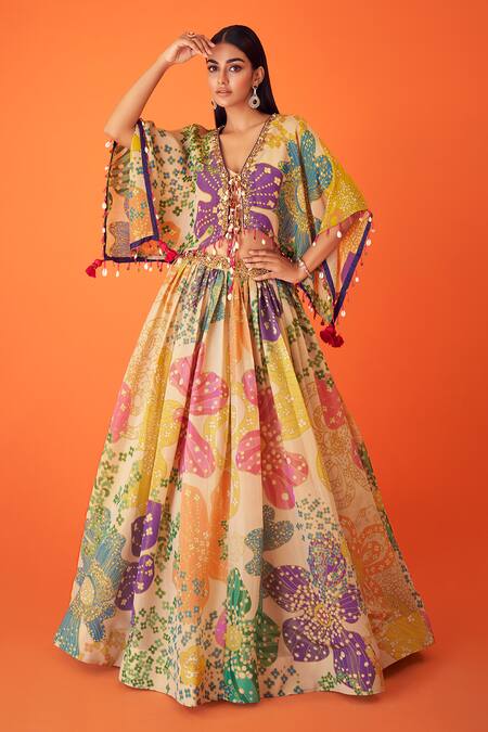 Multi color floral print kaftan featuring a draped bodice and tasselled details. Paired with a padded inner bustier and a can can attached flared lehenga.