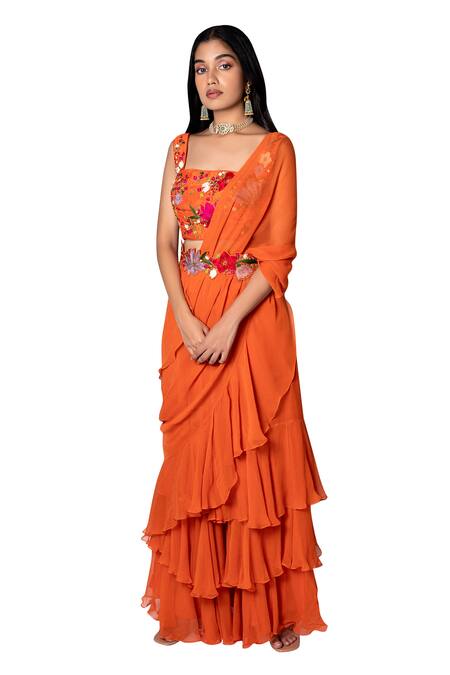 Orange pre-stitched saree with layered ruffles. Paired with floral embroidered blouse & detachable floral embroidered belt.