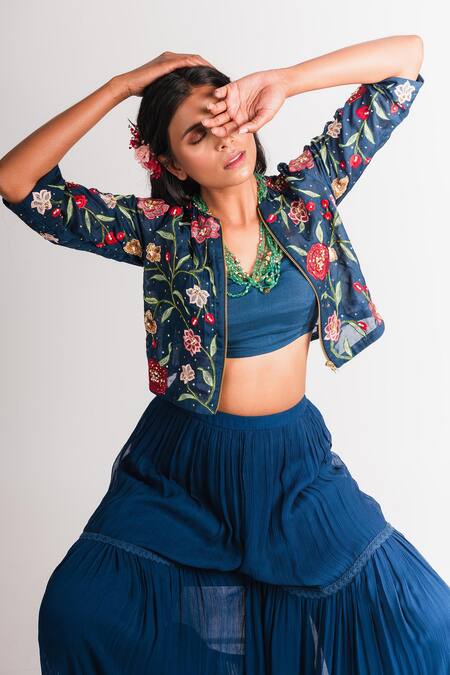 Blue high waist flared pant with tier detail. Comes with crop top and jacket.
