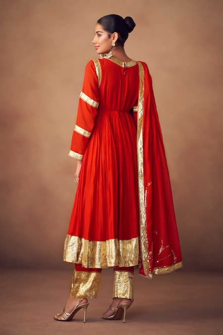 Red Anarkali set featuring a flared silhouette and gold detailing. Paired with matching pants and a dupatta with intricate embellishments.