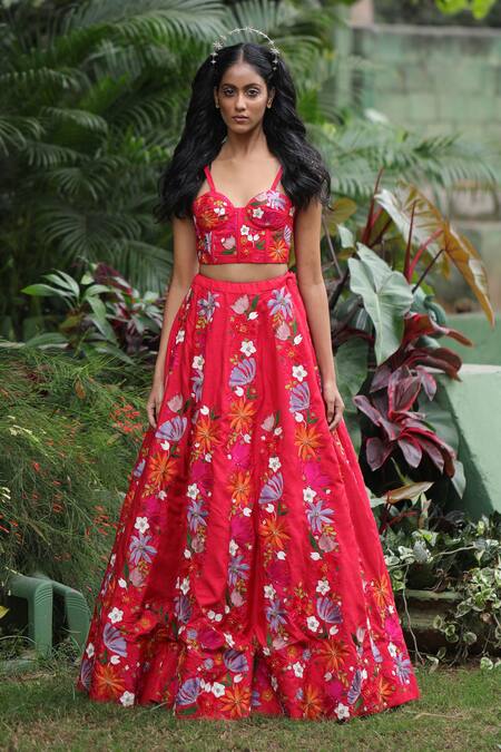 Red raw silk lehenga with wildflower embroidered motifs. Paired with corset style blouse & organza embroidered dupatta.
