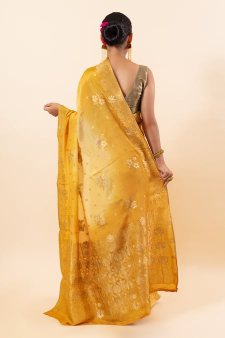 Yellow saree in a wrinkled crepe fabric featuring alfi border and floral buttas. Paired with a running blouse.