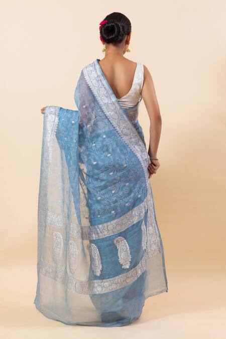 Grey chiffon saree featuring all-over thread embroidery and silver zari buttis. Comes with a running blouse piece.