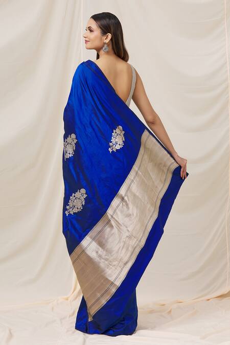 Royal blue pure handloom katan silk saree with contrast floral buttas. Comes with running blouse.