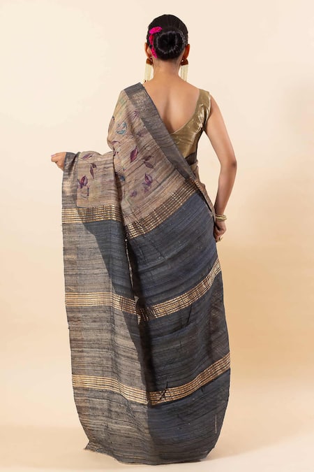 Grey saree featuring digital print leaf patterns and a thin border. Paired with a running blouse in coordinating fabric.