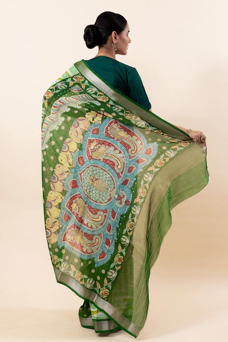 Green Chanderi Silk Madhubani Print Saree With Running Blouse