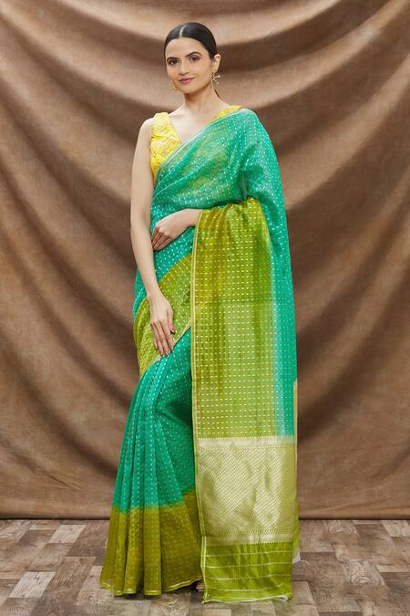 Green pure organza saree with small chunari buttis & contrast border. Comes with unstitched blouse piece.