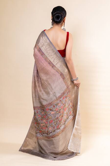 Buy_Taba Kashi By Artika Shah_Grey Russian Silk Placement Print Saree With Unstitched Blouse Fabric