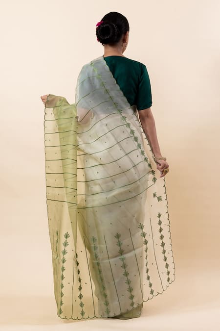 Pista green ombre saree featuring a scallop trimmed border. Paired with a running blouse made from Kora fabric.