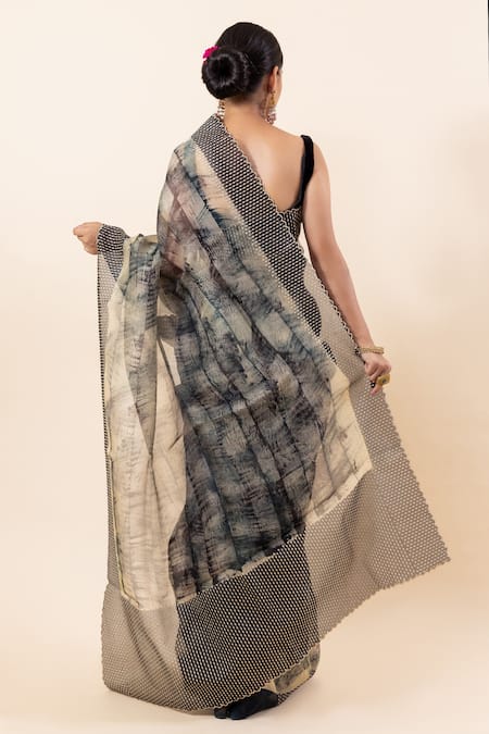 Beige, grey and black Kota saree featuring a block textured print with scallop stripe work on the border and pallu. Paired with a running blouse in a coordinating design.