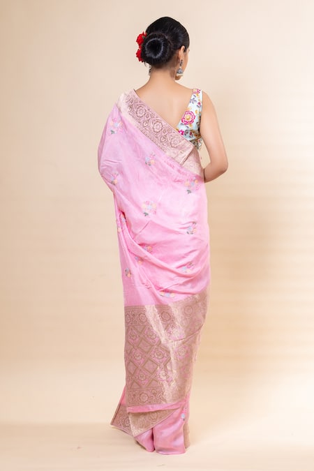 Buy_Taba Kashi By Artika Shah_Pink Russian Silk Embroidery Saree With Unstitched Blouse Fabric _Online_at_Aza_Fashions