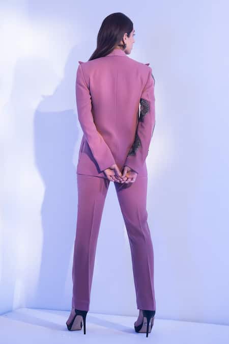 Purple Snake Embroidery Wide Notched Lapel Embellished Sleeved Blazer And Pant Set