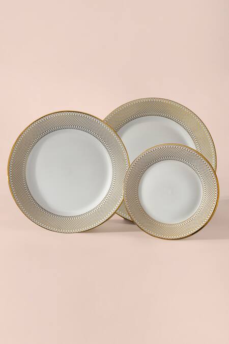 White bone China set of 3 plates in circular shape with gold rim on the edge & intricate checkered border.