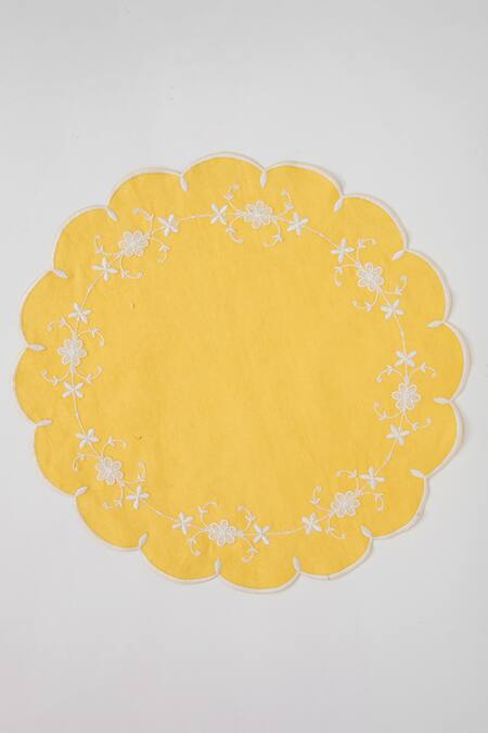 Yellow linen napkins with floral cut work pattern, scalloped edges & contrast white blooming flower pattern thread embroidery.