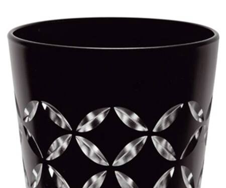 Black round glass water tumbler with contrast tone leaf motif jaal work.