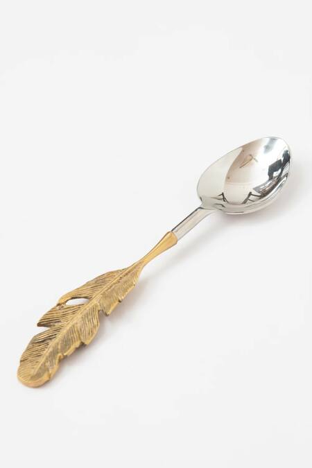 Gold, silver set of 4 cutlery in stainless steel & brass base with with leaf carved handle on top.