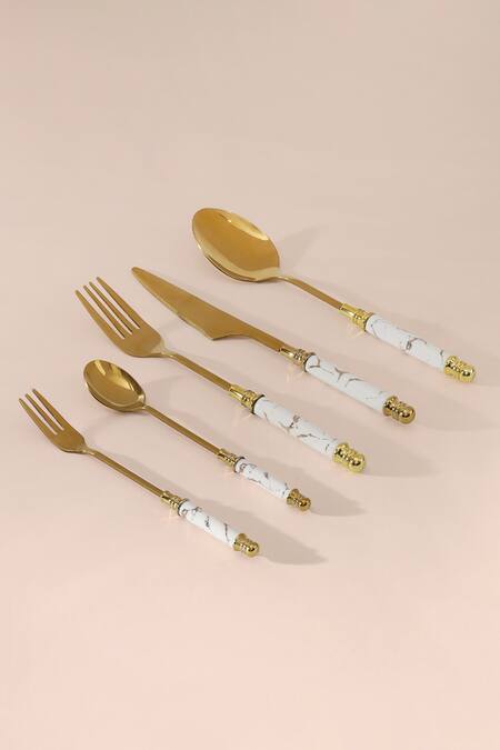 Buy_Table Manners_Gold Stainless Steel/ Reinforced Porcelain Marble And Cutlery Set_at_Aza_Fashions