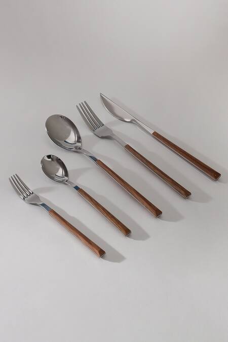 Buy_Table Manners_Silver Stainless Steel Wood And Cutlery Set_at_Aza_Fashions