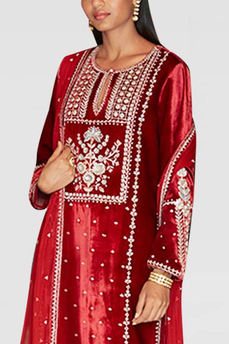 The opulent red Tabu Set is sure to turn heads with its velvet kurta. It is paired with matching bottoms and an embroidered net dupatta.