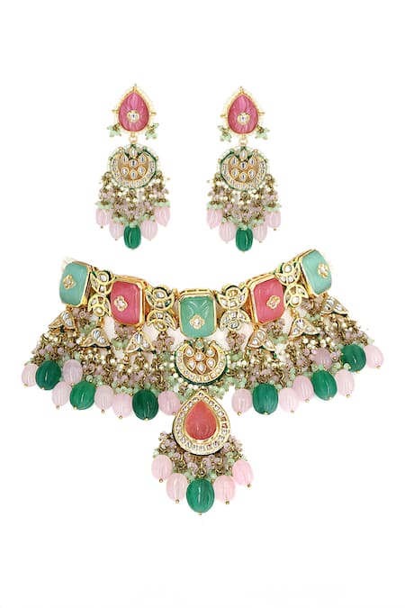 Gold finish with multicolored semi precious stones, Kundan detailing on necklace and earrings, Intricate beadwork with dangling elements
