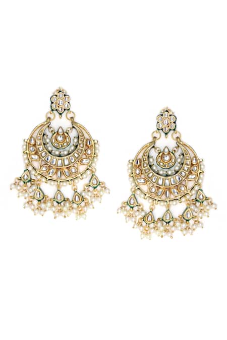 Gold tone chandbalis featuring white imitation kundan with pearl drops