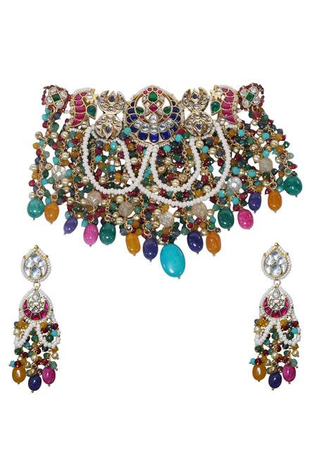 Multi color two tone finish necklace featuring imitation Polkis and semi precious stones. Paired with matching earrings designed with similar embellishments.