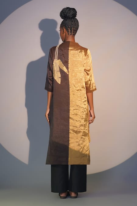 Gold and brown tunic featuring a notch neckline, three-quarter sleeves, and banana bunch embroidery. Paired with black pants featuring an elasticated waistband.