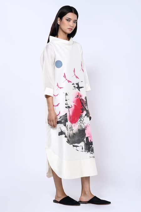 Ivory chanderi tunic featuring placed brushstroke abstract and dragonfly patterns with side slits. Comes with an inner for added comfort and coverage.