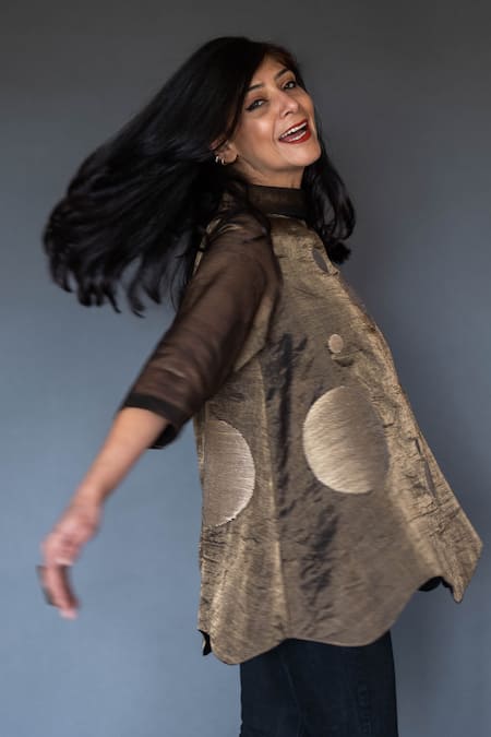 Bronze Chanderi tissue top with embroidered geometric motifs.