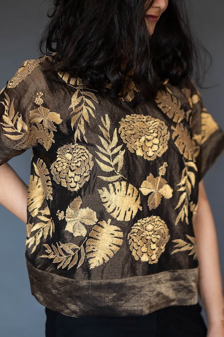 Bronze Chanderi tissue top with embroidered floral motifs.