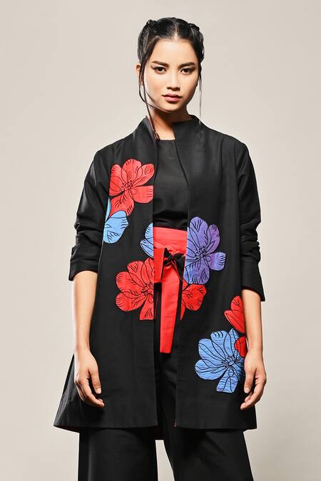Black jacket featuring hibiscus applique work and a high neckline