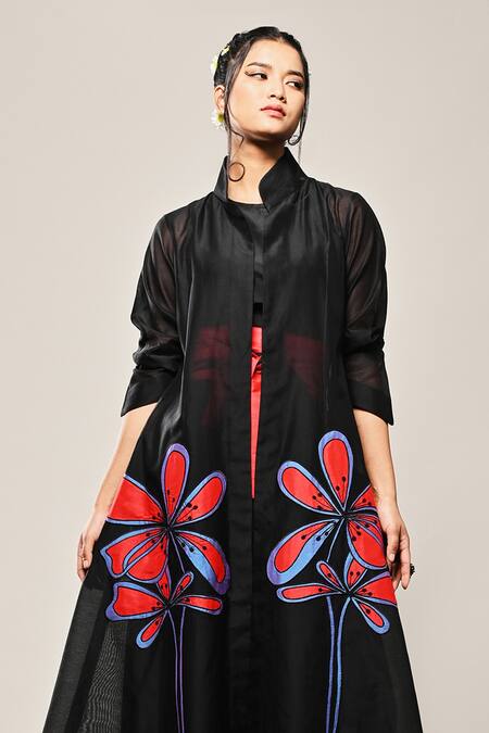 Floral applique work on the front and back, High neckline design, Three-quarter sleeves for added style