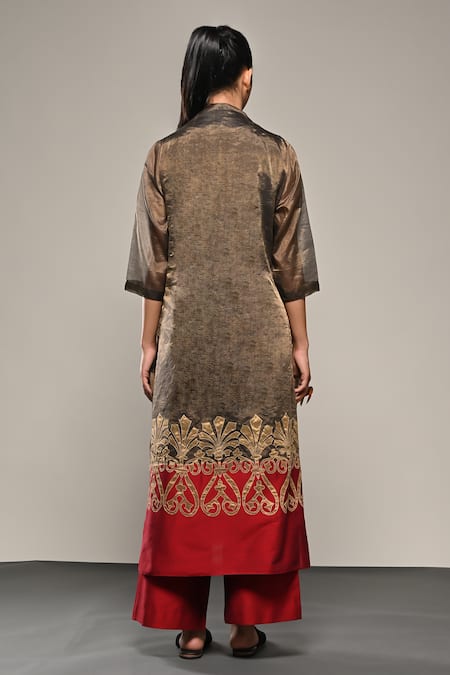 Gold and red kurta featuring vase and leaf applique work with a high neckline. Paired with burgundy flared pant for a coordinated look.
