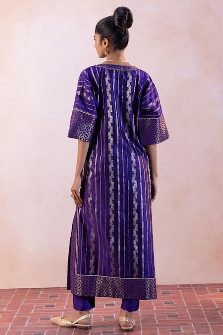 Purple floral stripe detail V neck kaftan kurta made from pure handwoven spun silk. Paired with matching pure spun silk pant for a coordinated look.