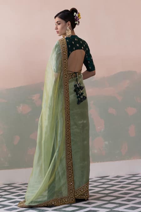 Green handwoven tissue silk saree featuring a sequin and thread embroidered border. Paired with a padded blouse with back tassel tie-up and petticoat.