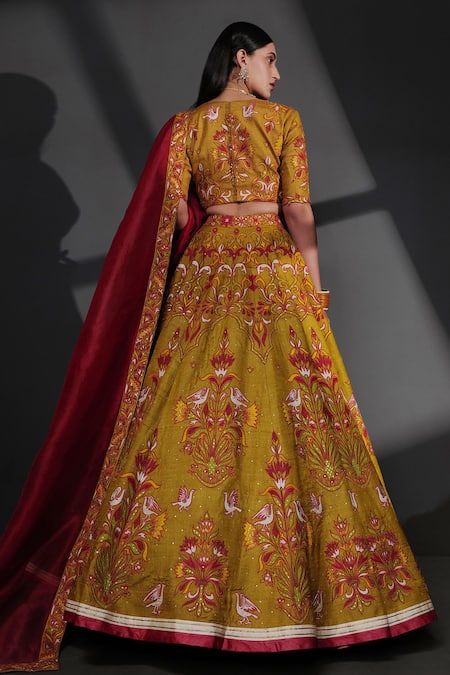 Multi Color Tussar, Silk Organza Hand Applique Work Bridal Lehenga Set