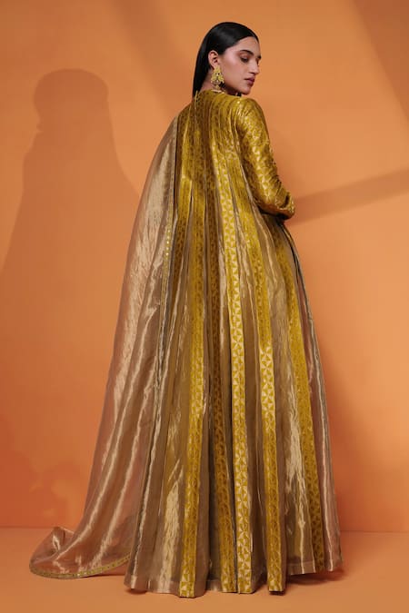 Tea green handwoven pure katan silk anarkali featuring geometric pattern panels and churidar sleeves. Paired with a pure zari tissue dupatta with couching embroidered border.