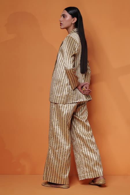 Brown flared pant in pure katan silk featuring hand woven geometric patterns