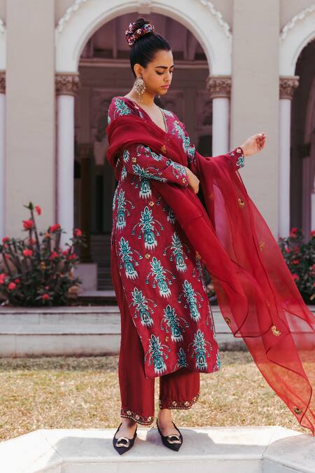 Red mulberry silk hand block print kurta with embroidered detail. Paired with embroidered hem pant and dupatta.