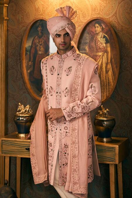 Pink silk sherwani featuring thread and zari embroidered floral motifs. Paired with a coordinating embroidered stole, chanderi safa, and solid pant.